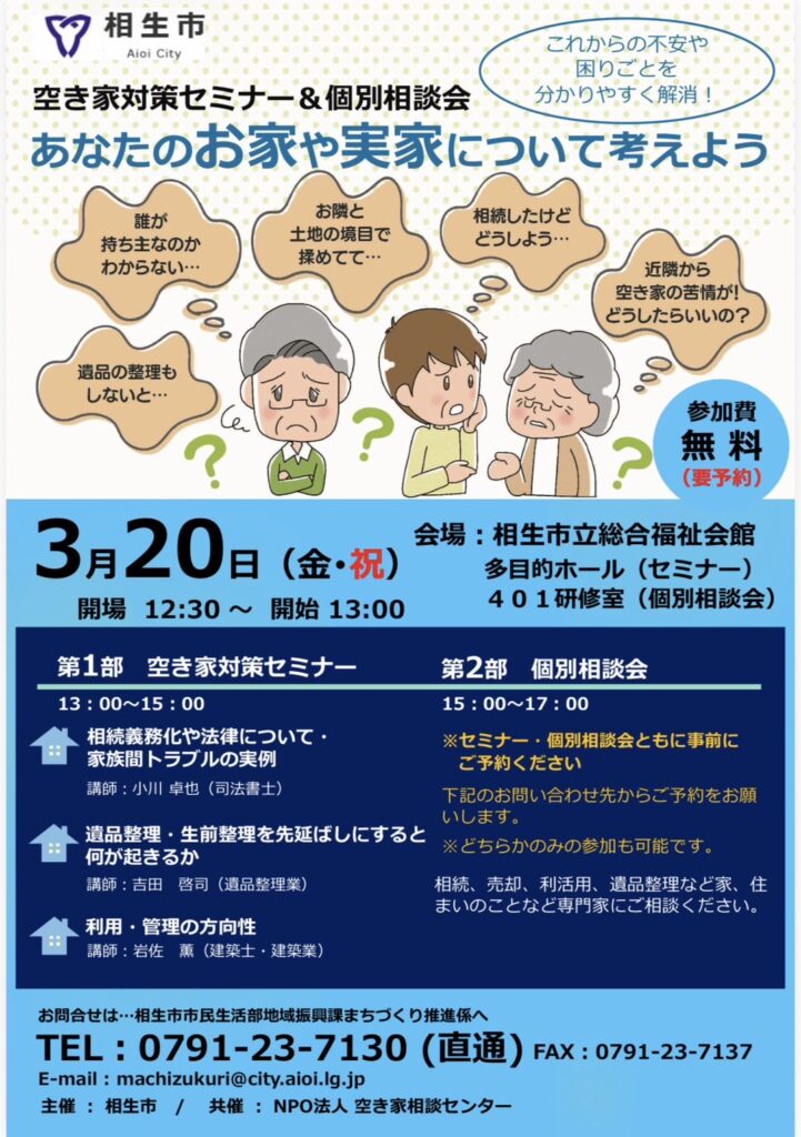 相生市ー空き家対策セミナー&個別相談会の開催 2026 2/15 【日時】3月20日(金・祝) セミナー13:00~、個別相談会15:00~ 【場所】相生市立総合福祉会館多目的ホールで開催されます。 相続、売却、利活用、遺品整理、不用品の回収など、空き家に関する悩み事を専門家にご相談ください。 また、未来ie不動産では事前予約受付中です。(当日、混み合いますと相談時間に制限があります。) お知らせ